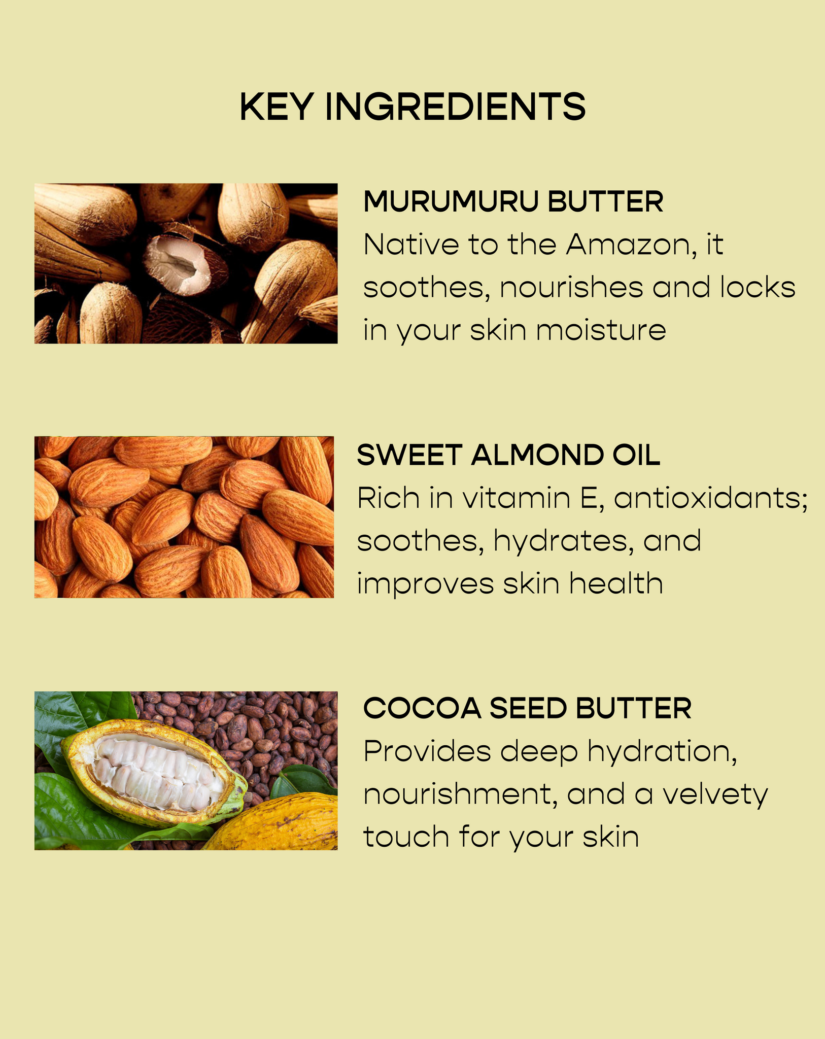 Ingredient list: Aqua (deionised water), Theobroma Cacao (Cocoa) Seed Butter (cocoa bean), Glyceryl Stearate SE (olive and coconut), Glyceryl Citrate/Lactate/Linoleate/Oleate (sunflower), Glycerin (rapeseed oil), Astrocaryum Murumuru Seed Butter (murumuru), Capric Caprylic Triglyceride (coconut), Parfum (fragrance), Benzyl Alcohol (ECOCERT natural preservative), Salicylic Acid, Sorbic Acid, Prunus Amygdalus Dulcis (Sweet Almond) Oil, Xanthan Gum (wheat), Bisabolol (candeia tree), Tocopherol (vitamin E), Sodium Hydroxide, Citral.